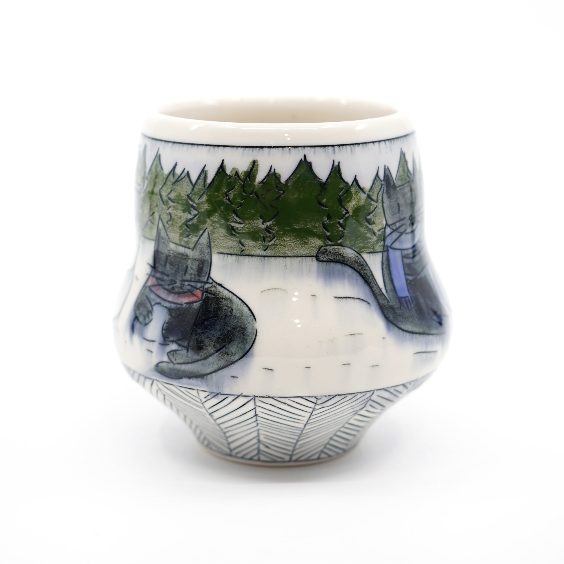 Measures about 3.5 inches tall, 4.25 inches wide and holds approximately 12 fl oz.