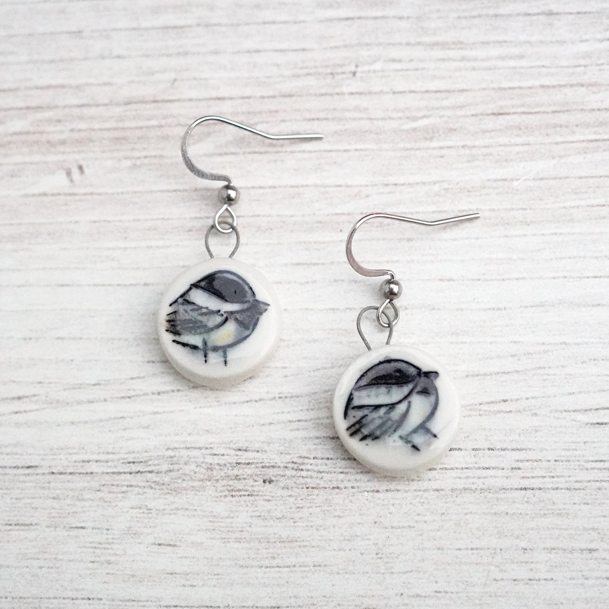 These chickadee earrings are on hypoallergenic 316 surgical stainless steel earring wires and come in a little box.