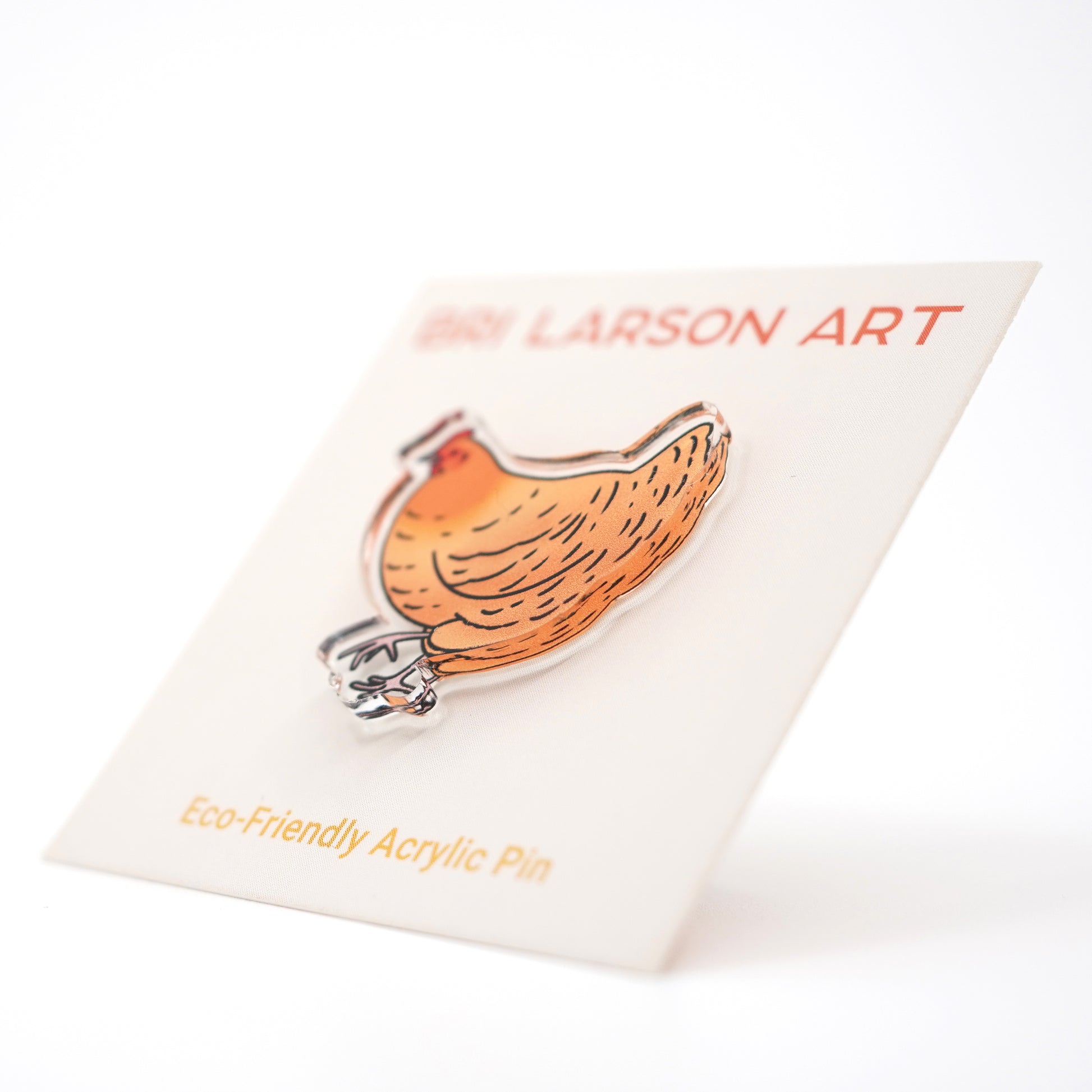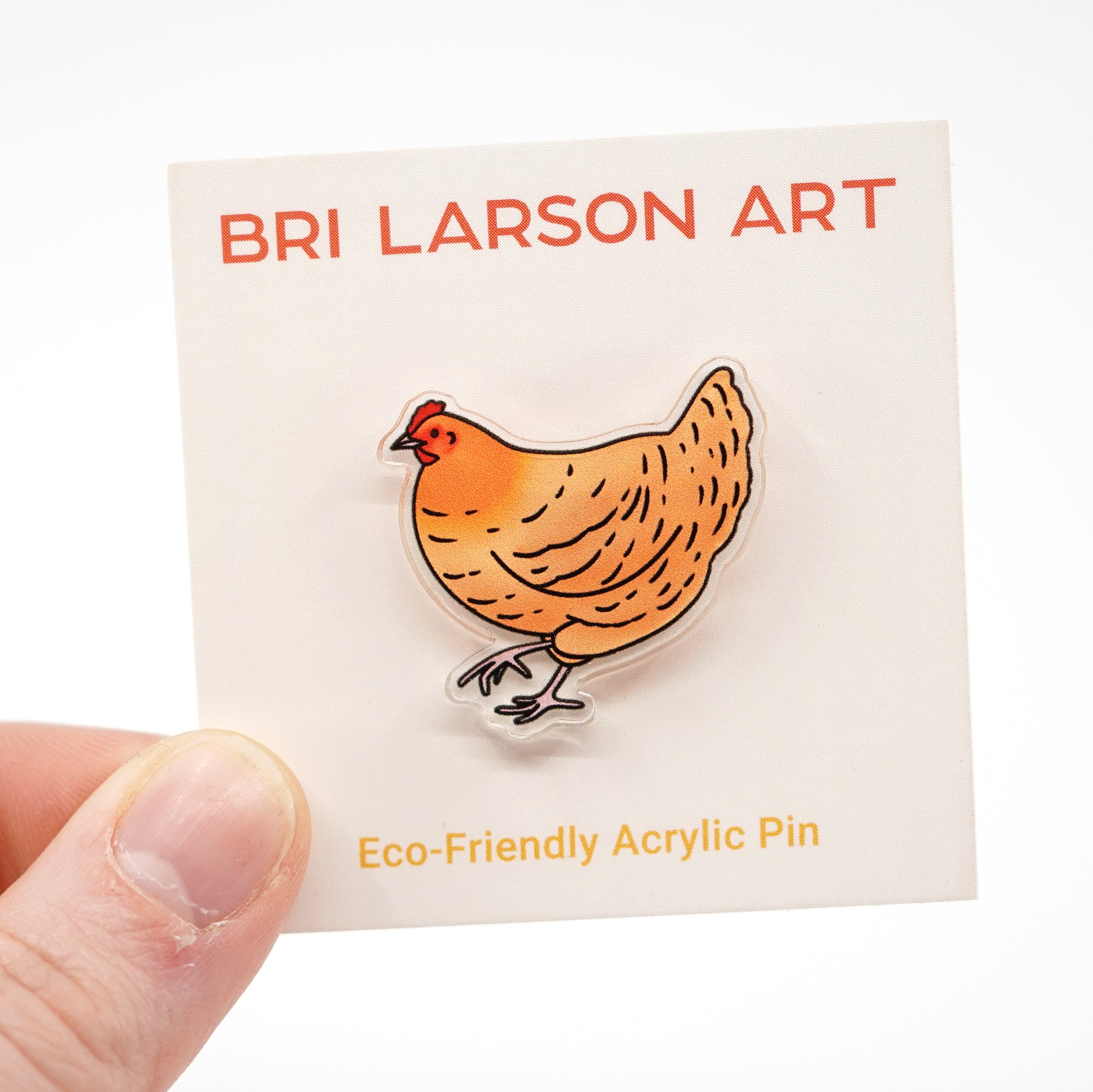 Show off your love of chickens with this eco-friendly acrylic pin! Measures approximately 1.25 inches wide.
