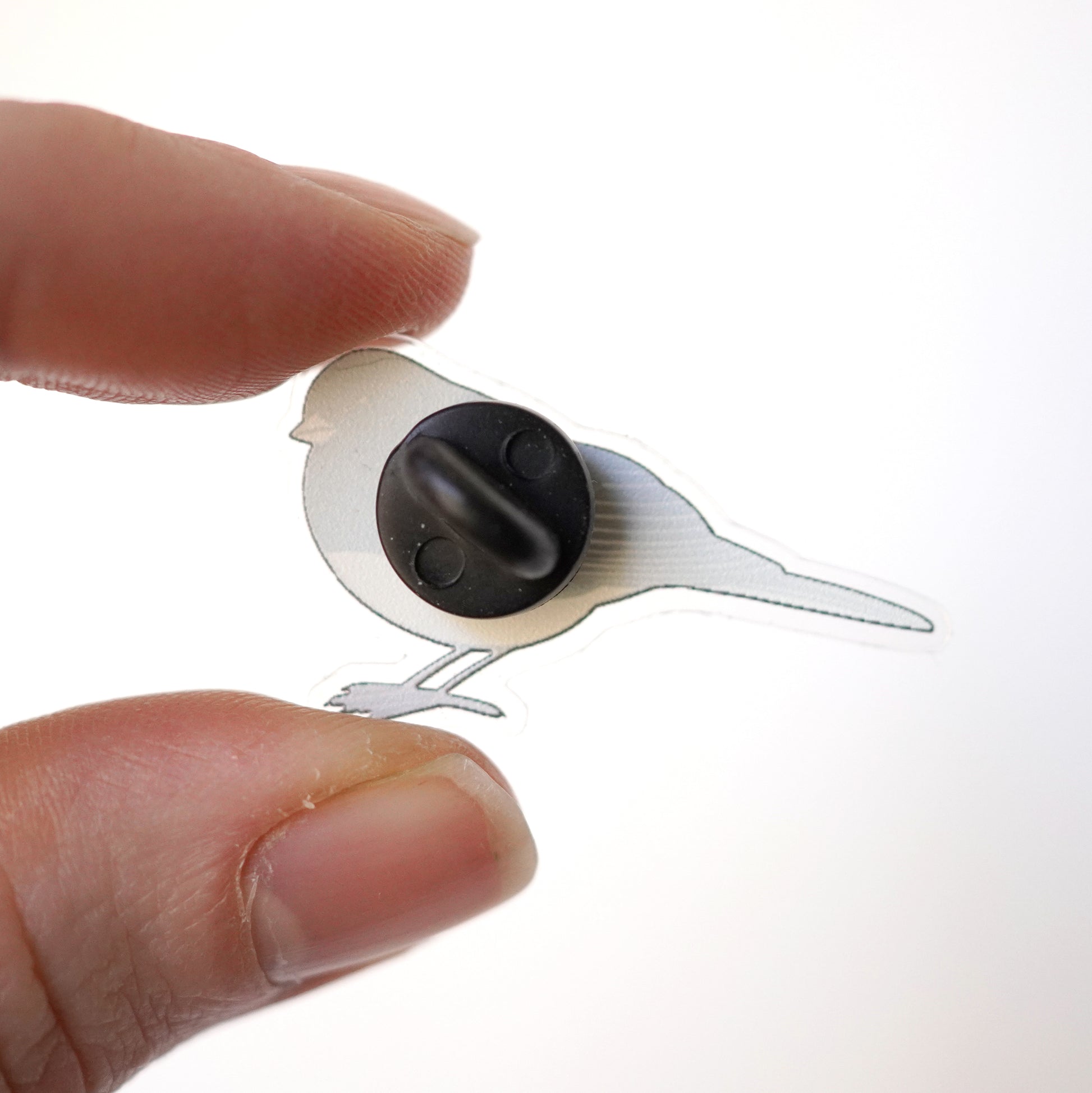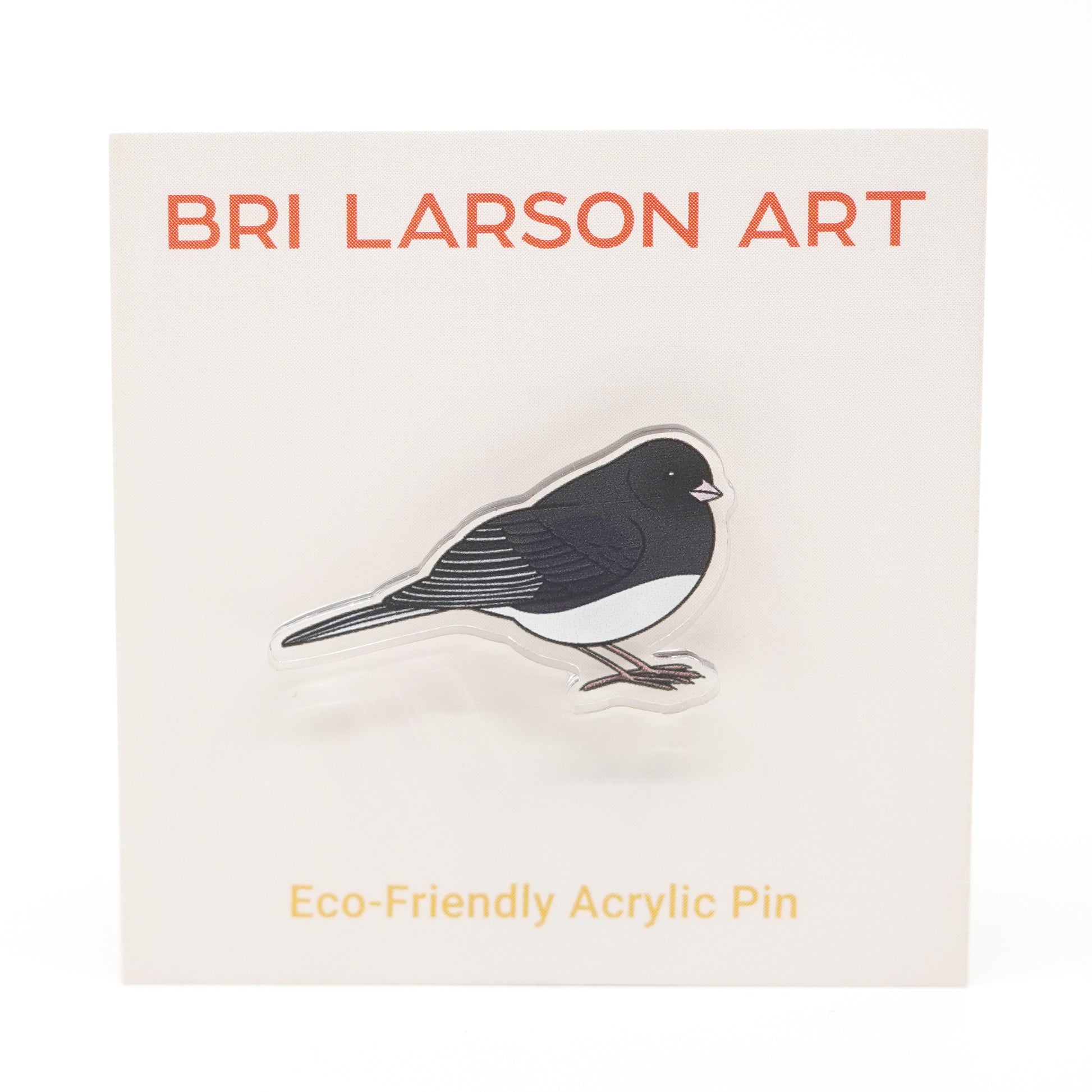 Show off your love of the dark eyed junco with this eco-friendly acrylic pin! Measures approximately 1.25 inches wide.