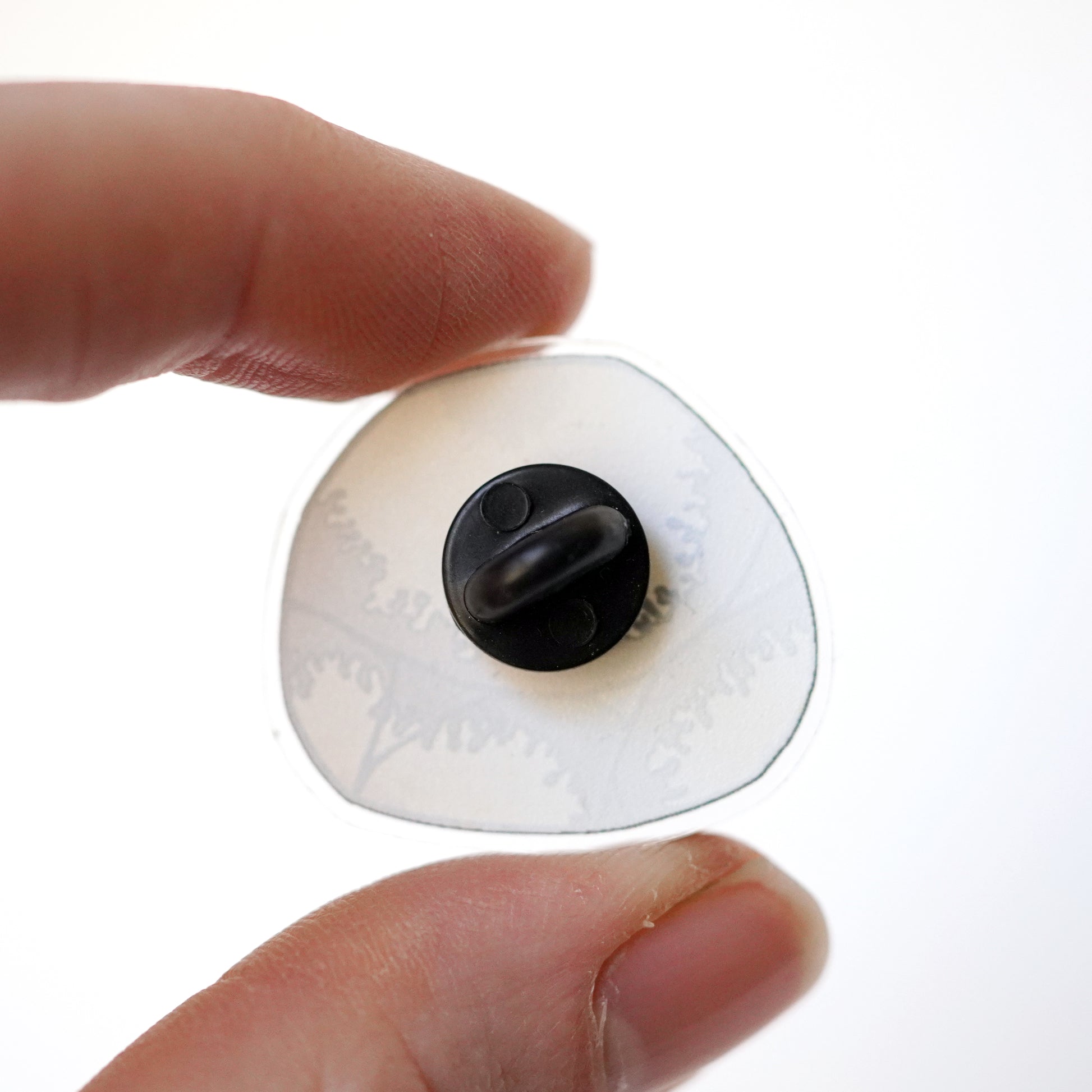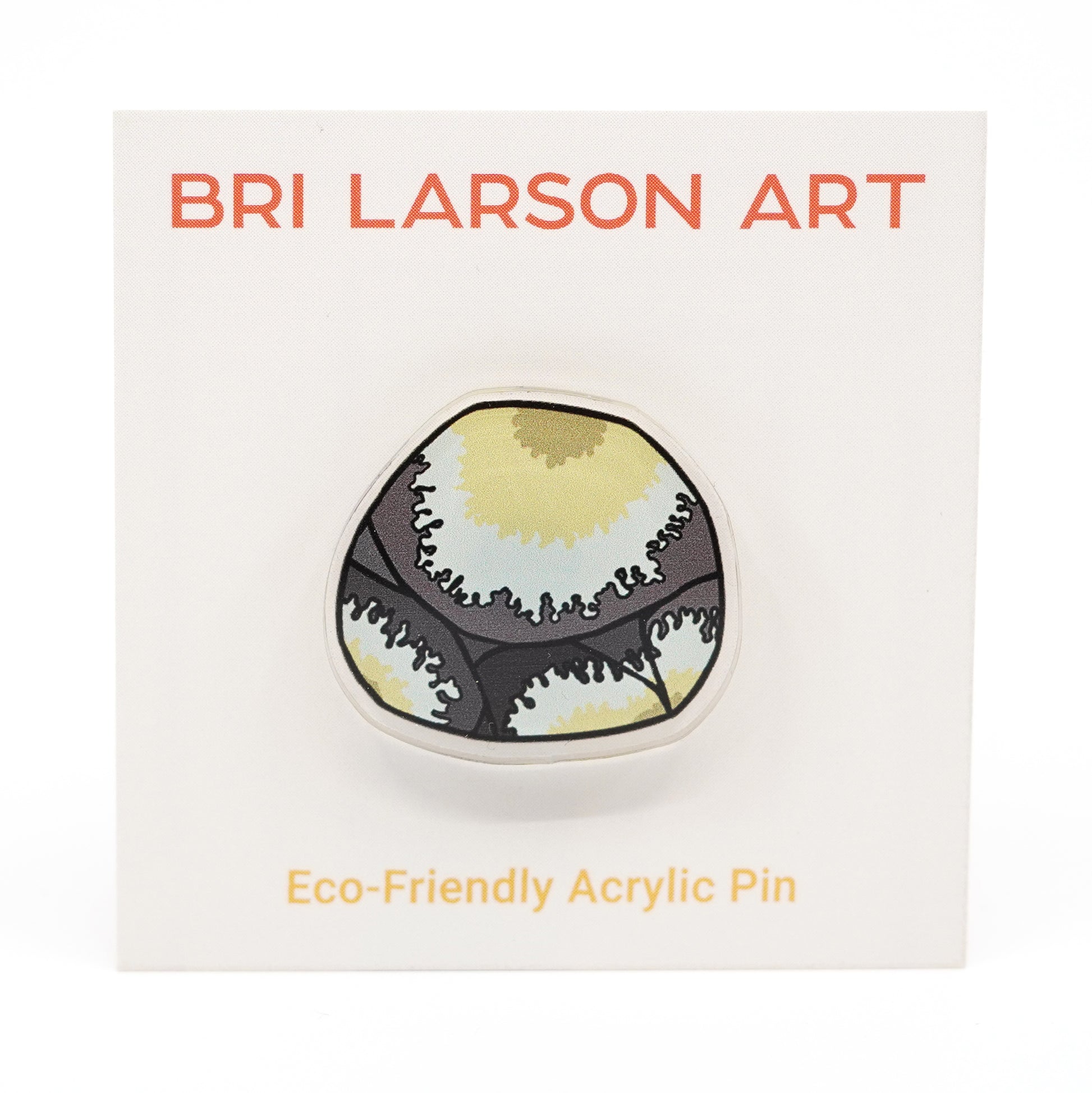 Inspired by lichen-covered New England rocks, this pin is perfect for geology lovers! This eco-friendly acrylic pin measures approximately 1.25 inches wide.