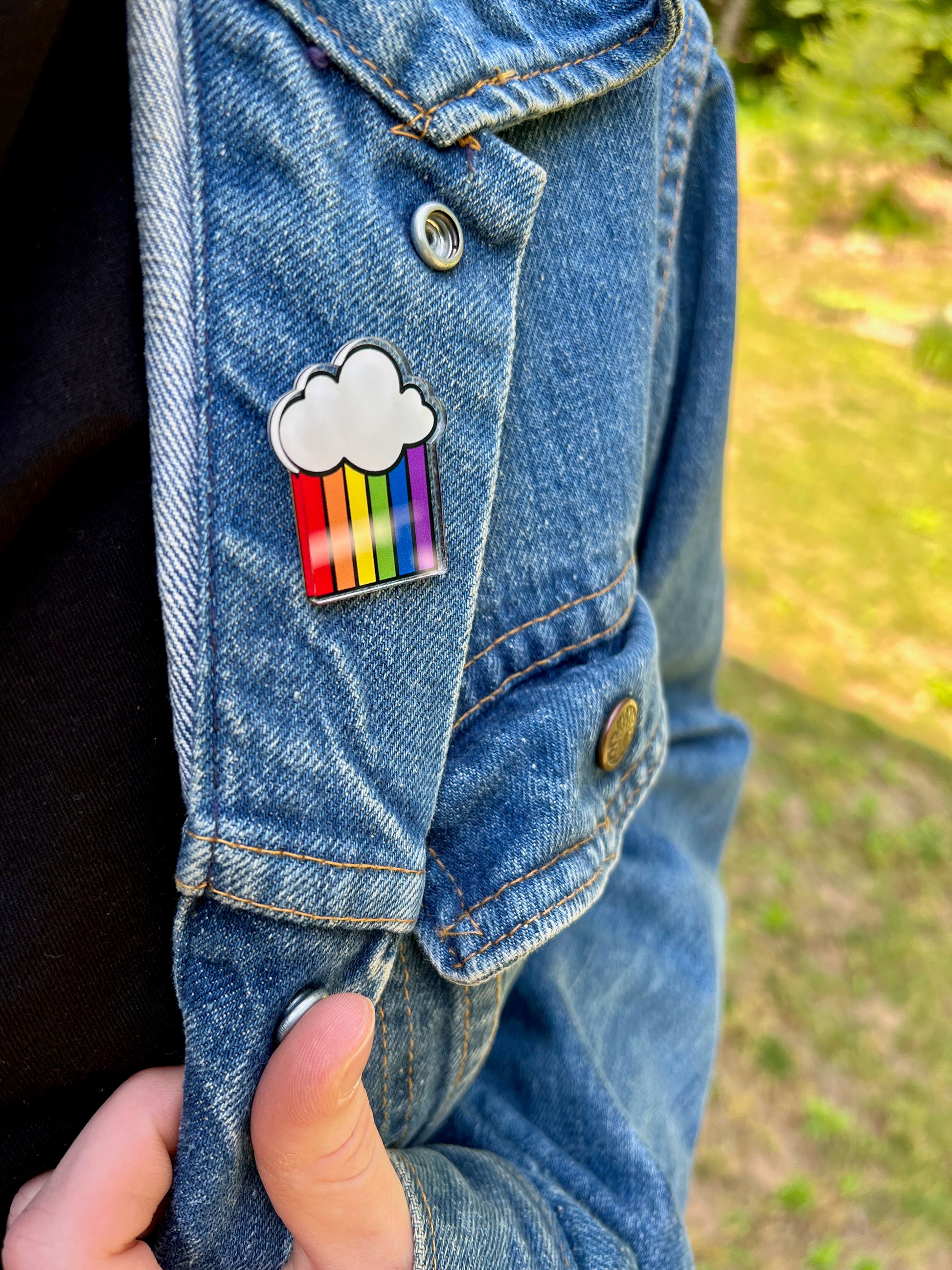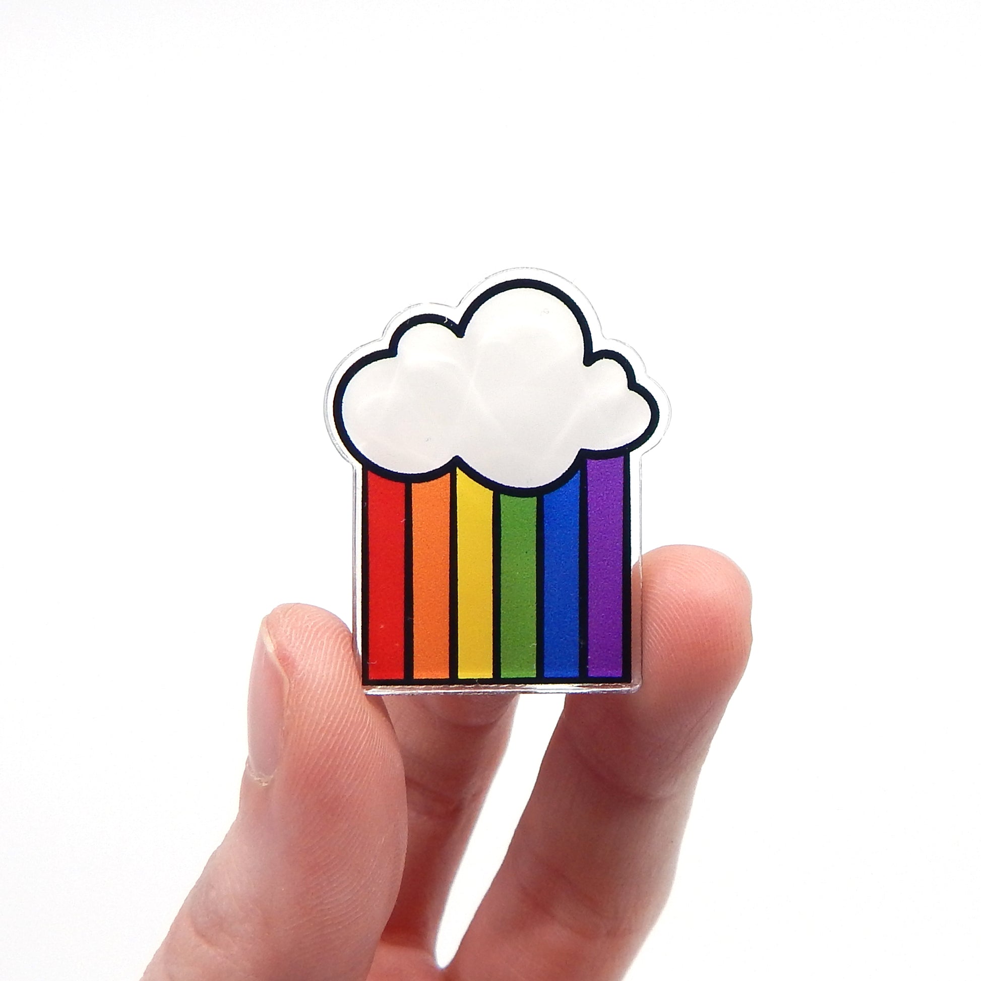 This eco-friendly acrylic pin is perfect for those who always see rainbows in the clouds! Measures approximately 1.25 inches wide.