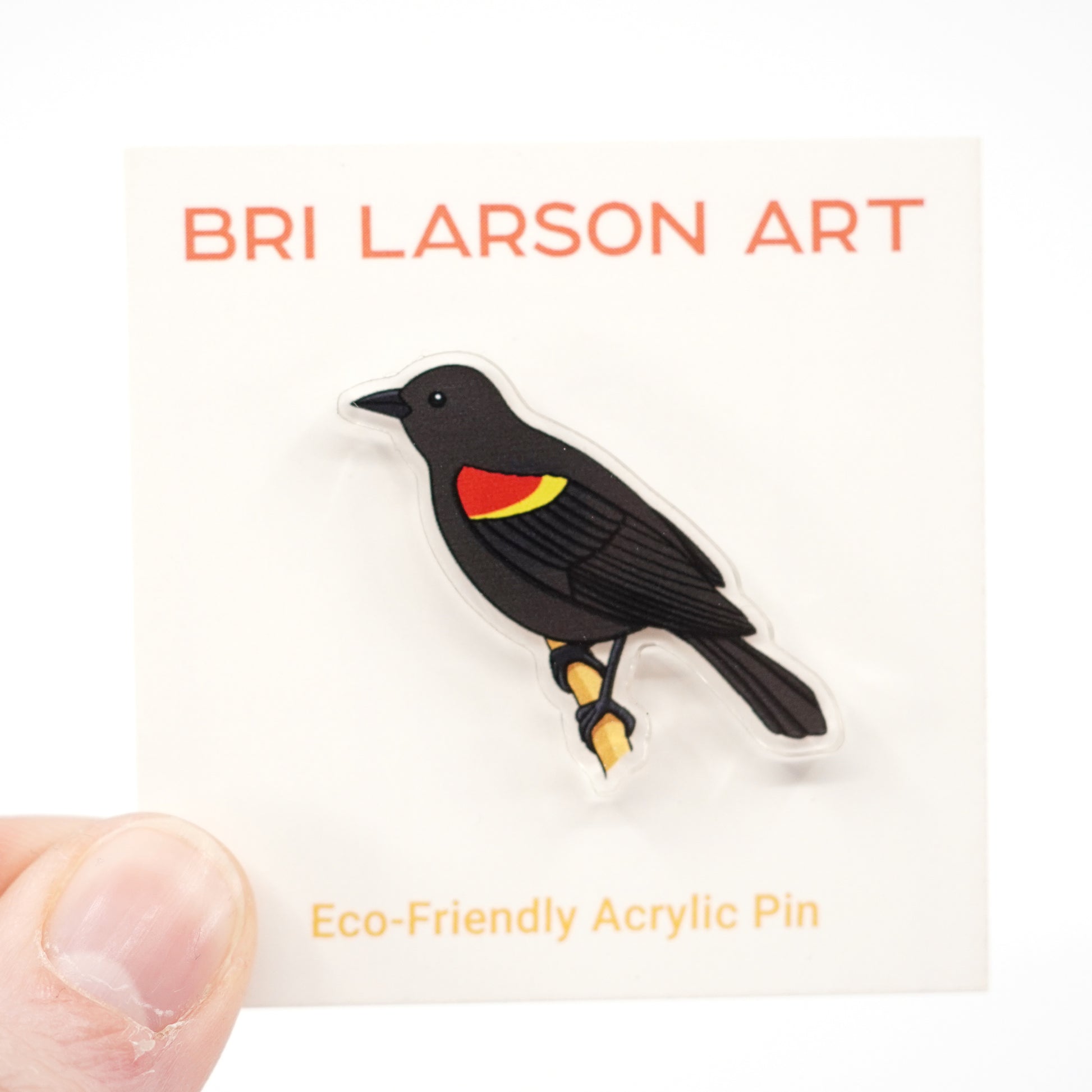 Show off your love of the red winged blackbird with this eco-friendly acrylic pin! Measures approximately 1.25 inches wide.